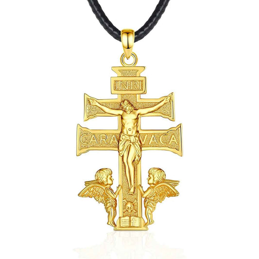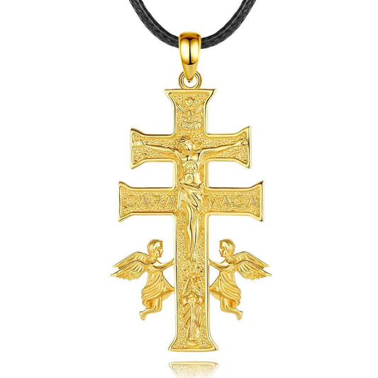 18K Gold Plated Silver Caravaca Cross Necklace with Angel and Mary