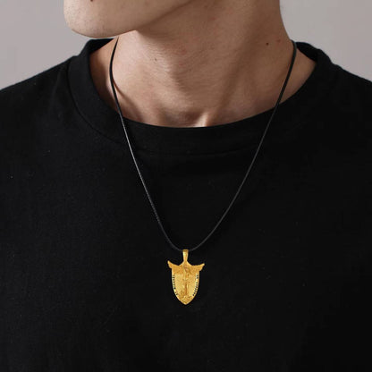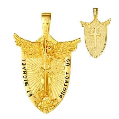 Colgante de escudo de San Miguel bañado en oro de 18K, símbolo de protección y valor. Ideal para quienes buscan un accesorio con significado.