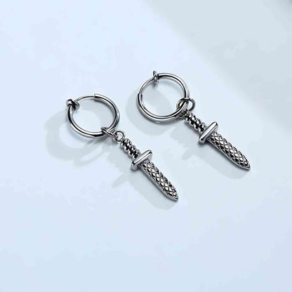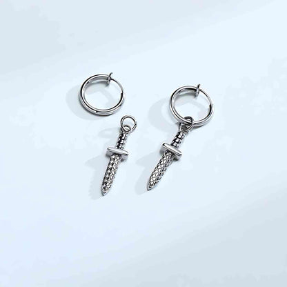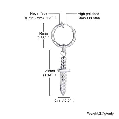 Los Aros Colgantes con Daga presentan un diseño unisex elegante fabricado en acero inoxidable 316L plateado para estilo y comodidad duraderos.