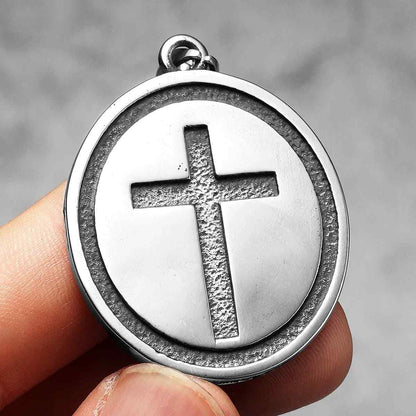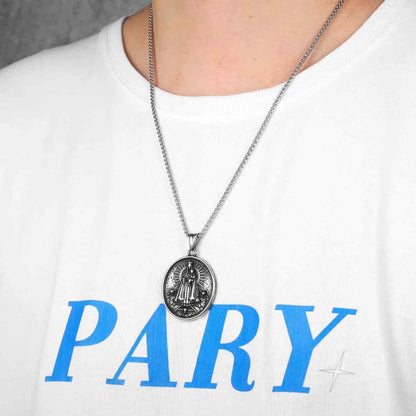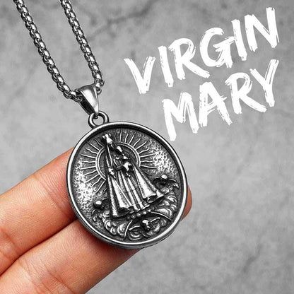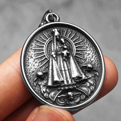 El Colgante Redondo de la Virgen María con Rayos presenta una detallada imagen de la Virgen María, rodeada por un diseño de rayos radiantes en el frente. El reverso muestra una simple pero elegante cruz. Este colgante redondo simboliza fe, protección y guía divina.