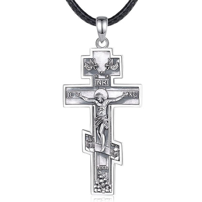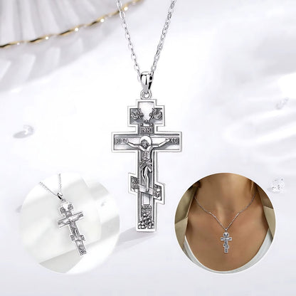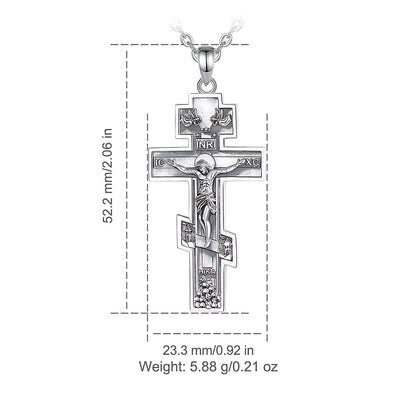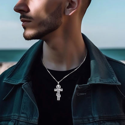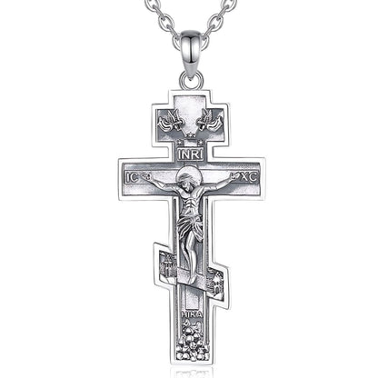 Collar de Cruz Ortodoxa Oriental de Plata, una pieza unisex de plata 925. Presenta un crucifijo detallado, reflejando elegancia y significado espiritual.