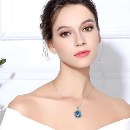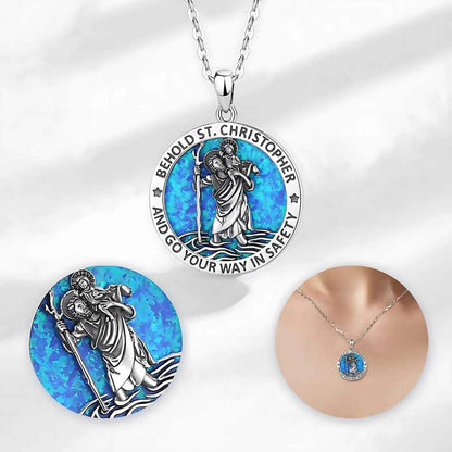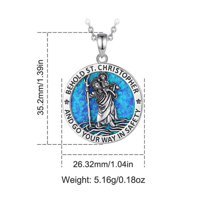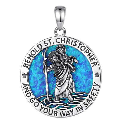 Medalla de San Cristóbal con Incrustación de Ópalo, una pieza impresionante que captura la esencia de la protección. Este colgante unisex presenta a San Cristóbal llevando a un niño, con un fondo de ópalo azul que realza su silueta. Su diseño intrincado y colores vibrantes lo convierten en un accesorio significativo.