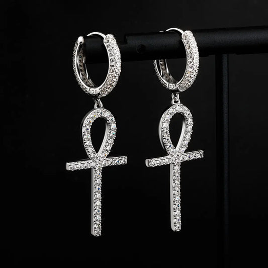 Boucles d’Oreilles Créoles Croix Ankh Givrées en Or Blanc 18K
