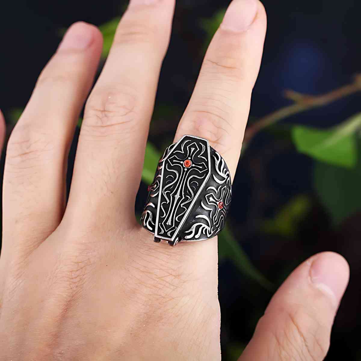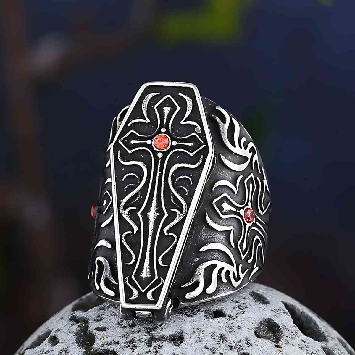 Croix Cercueil Bague avec Gemme Rouge
