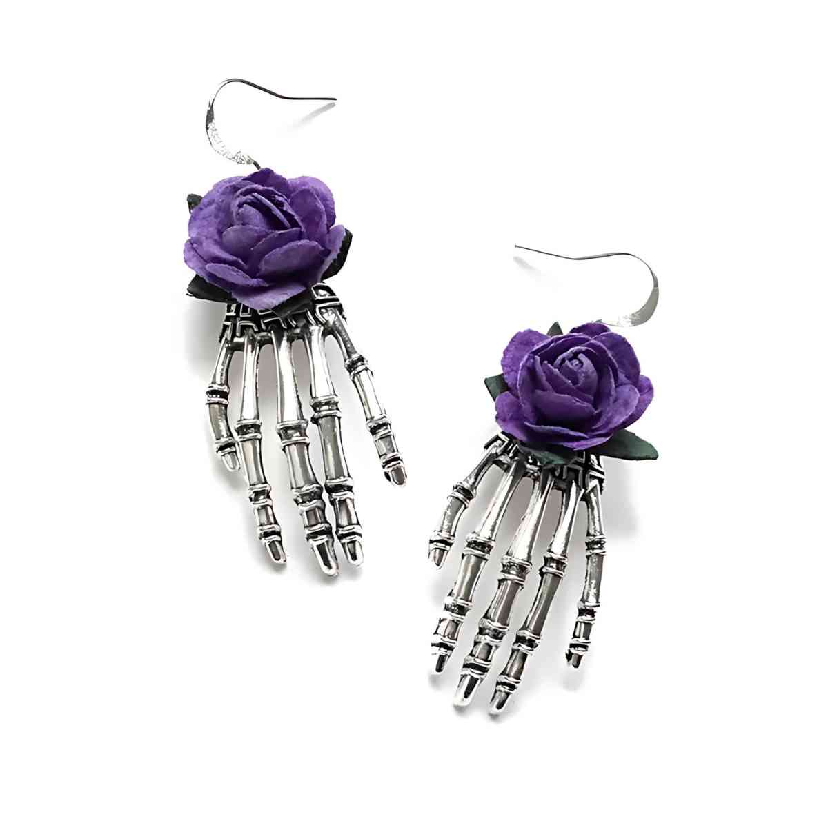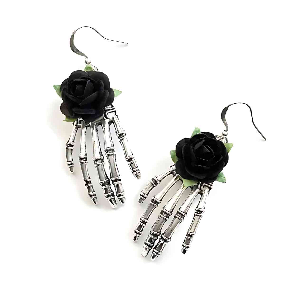 - Conception unique:Boucles d'oreilles à main squelette ornées de roses vibrantes, créant un look saisissant et accrocheur.