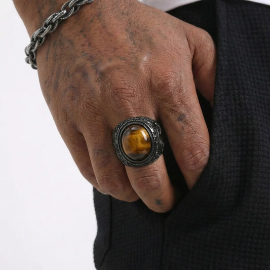 Anello a Sigillo in Occhio di Tigre Nero con Volute