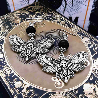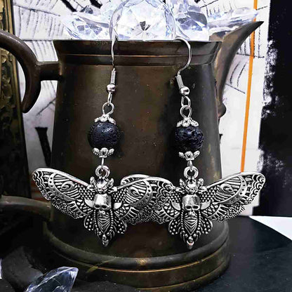 Kolczyki z motywem ćmy i czaszki na kaboszonie.