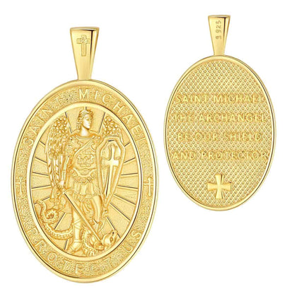 The 18K Gold Plated Silver St Michael Pendant Oval features a beautifully detailed design of St. Michael, symbolizing strength and protection. The front showcases St. Michael in a heroic pose, while the polished reverse side is engraved with the words "Saint Michael, Protect Us." This unisex pendant is a meaningful accessory for anyone seeking guidance and support.